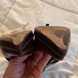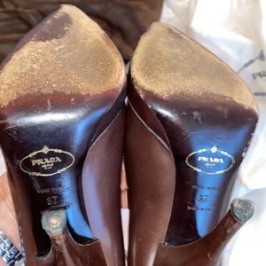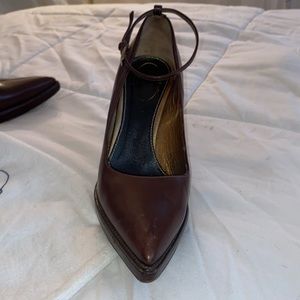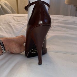 Leather uppers and soles. Removable ankle straps with silver buckles, 3/4” base platform, 4 1/2” heel (equates to 4” heel) comfortable chic and classy.