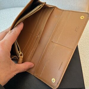 Worn camel leather wallet. Bought many years ago and overall structure is fine but there are marks on edges. All