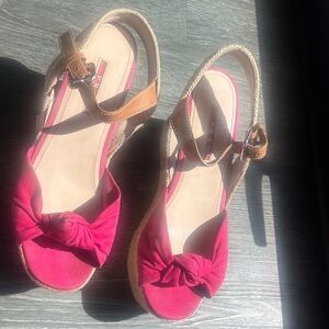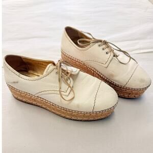 Chic Prada espadrille wedges in tan. Features stylish bow detail. Perfect for any occasion.