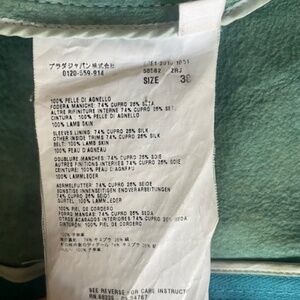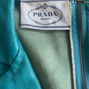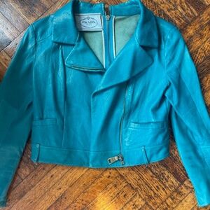 Turquoise cropped style leather jacket from Prada.