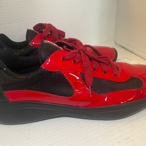 Step out in style with these Prada men's sneakers, featuring a striking red and black design. Perfect for adding a bold touch to any outfit.