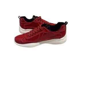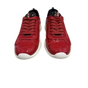 The product is a pair of Prada Americas Cup Low Red Patent sneakers in UK size 8 (US size 9) for men. Made of patent leather, these casual shoes feature a sports theme and are part of the Americas Cup product line. The vibrant red color adds a pop of color to any casual outfit. With the iconic Prada brand, these sneakers are stylish and high-quality footwear for sports enthusiasts or fashion-conscious individuals.
