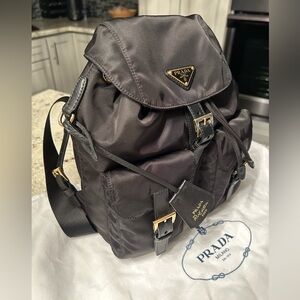 Prada Black Backpack. Never used, got it as a gift in September. Comes with dust bag and certificate of authenticity. Large interior for being a small bag. Inside is a pocket as well as a zipper pocket.