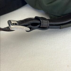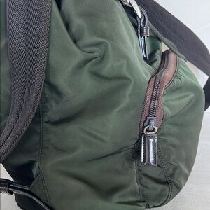 Elegant Prada nylon backpack in dark green. Features durable straps and zippered front compartment. Very good condition. Inside clean. Leather shiny but has some wear on edges. Nylon has some color fade but still looks great. Unisex style.