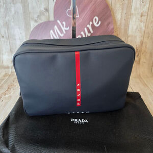 This is a Prada Beauty pouch, new without tags or box. The exterior is a smooth, dark blue material with a red stripe and the Prada logo. It features a zippered closure and a black interior lining. The pouch is accompanied by a black dust bag. There are no visible imperfections.