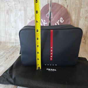 This is a Prada Beauty pouch, new without tags or box. The exterior is a smooth, dark blue material with a red stripe and the Prada logo. It features a zippered closure and a black interior lining. The pouch is accompanied by a black dust bag. There are no visible imperfections.