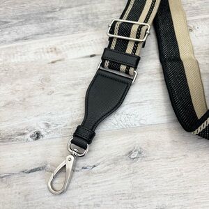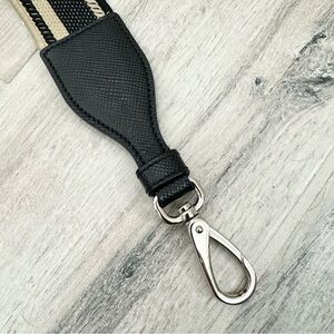 Prada Black Beige Logo Adjustable Shoulder Strap. The perfect strap to add to any Prada bags in your collection! 100% authentic. Black beige with logo along with black Saffiano leather trim. Adjustable. Length 49” at its longest, clasp to clasp. Width 1 3/4”. Silver tone hardware. Pre loved, barely used. Faint wear throughout. Excellent condition. Comes with Prada dust bag.