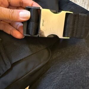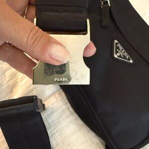 Elegant Prada belt bag in black. Perfect for hands-free convenience. Features iconic logo detail.