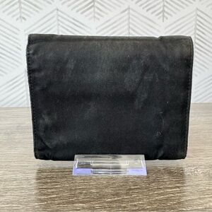 Elegant black Prada wallet. Features iconic logo on front. Sleek and stylish design. Has some wear on the inside but still has a lot of life left in her.