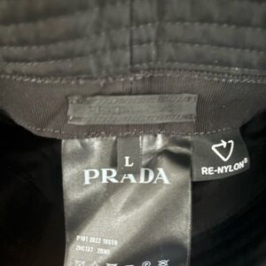 Stylish black bucket hat by Prada. Features iconic logo patch. Perfect for any occasion.