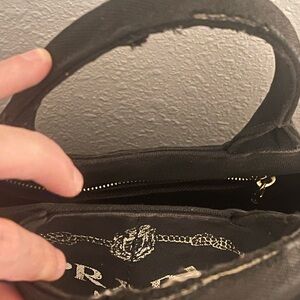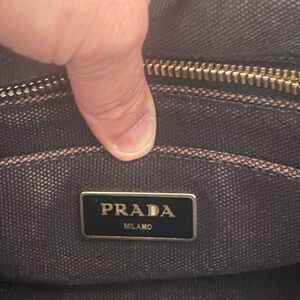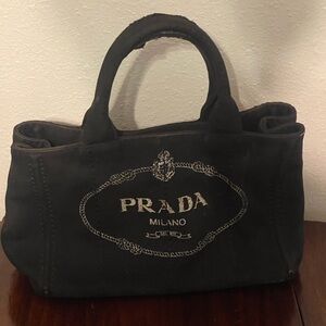 Chic Prada tote in black canvas. Features sturdy handles and iconic logo. Ideal for everyday elegance.