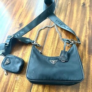 Stylish Prada shoulder bag with chain detail. Sleek black design. Ideal for versatile use.