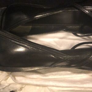 Prada Calzature Donna Carpetto Bicolo Flats. Criss cross design and a little bow. Excellent condition - well taken care of. Some wear on bottom but shoe overall in amazing condition. Original box & shoe bag included. Size 6 1/2, but run a little big; fit more like a 7.