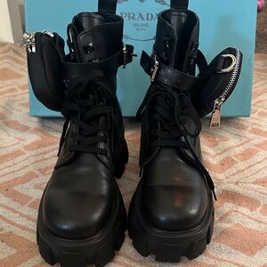 Elevate your style with Prada's chunky combat boots. Features a sleek black design and detachable pouch. Perfect for a bold, modern look.