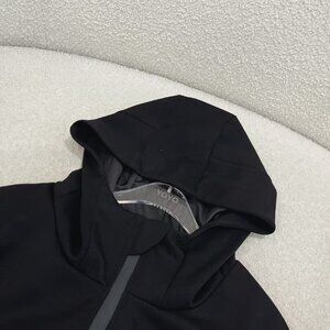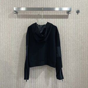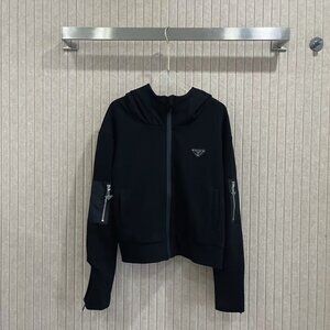 Hooded zip-up sweatshirt jacket in a relaxed fit. Versatile styling suits all body types, radiating youthful energy and vibrant spirit. Classic triangular brand logo adorns the chest. Triangular nylon pockets trim the cuffs. Adjustable zippered cuffs for a customizable fit. Casual yet fashion-forward.