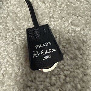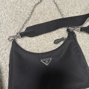 This Prada crossbody bag in black features a sleek, crescent-like shape crafted from a textured material, offering a minimalist yet sophisticated look. The bag includes a small triangular Prada logo on the front and a detachable mini pouch for added convenience. Its monochromatic design ensures a stylish and cohesive appearance for any occasion.