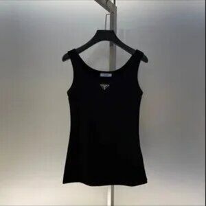 This sleek black tank top by Prada features a fitted design with a classic scoop neckline. Made from a smooth, solid fabric, it offers a timeless and versatile style perfect for any occasion.