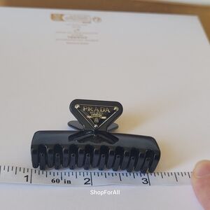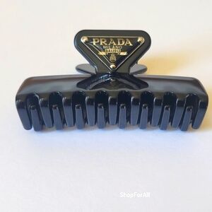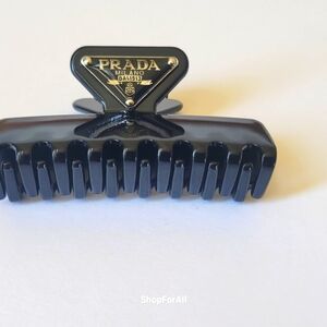 Elegant black hair clip with Prada logo. Perfect for styling.