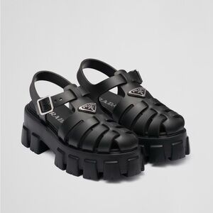 Chic Prada jelly sandals in black. Features adjustable straps and a modern design. Prada Monolith sandals size 38
