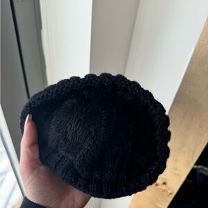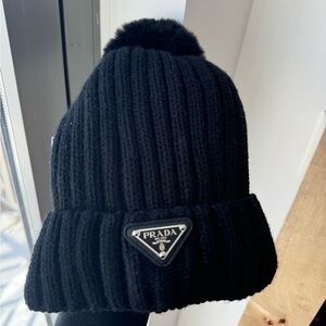 Stylish black knit beanie. Features a soft pom pom on top. Iconic Prada logo on the front.
