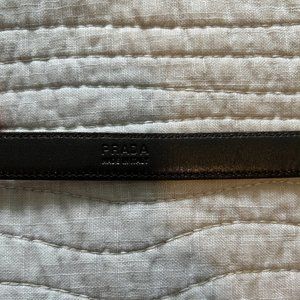 Elevate your accessory game with this black leather belt from Prada. Crafted with meticulous attention to detail, it offers a sleek and versatile addition to your wardrobe. Made from high-quality leather, this Prada belt exudes durability and style. The minimalist design features a sleek buckle, adding a polished finishing touch. Whether paired with jeans, trousers, or a dress, this black leather belt effortlessly enhances your ensemble.