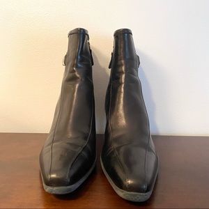 Authentic Prada leather black booties with square toe and buckle detail with rubber sole. European size 39.5/US size 9. Heel measures 3”.