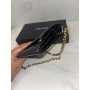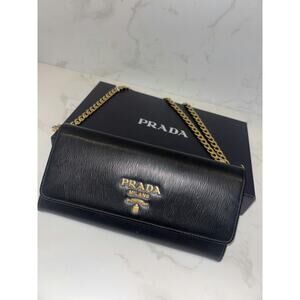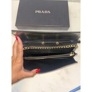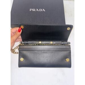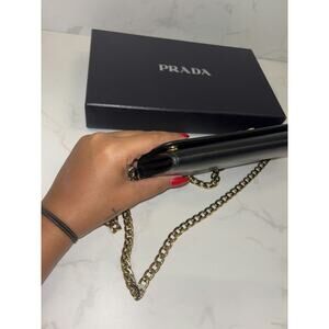 This Prada chain wallet is a classic piece that combines luxury and function. In excellent condition with only minor scratches, it offers a sleek look with its black leather and gold-tone accents. Ideal for both casual and formal occasions, it comes complete with a bag and box. Elevate your accessory collection with this timeless Prada wallet!