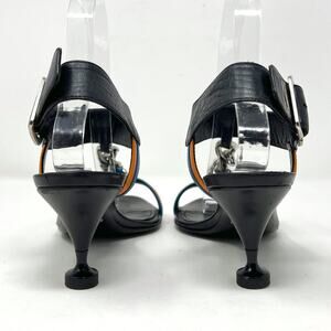 Add a punch of runway energy to your shoe game with these bold Prada sandals. Crafted in smooth black leather with vibrant orange and cobalt blue trim, these sandals feature a chunky silver-tone chain detail at the vamp and wide ankle straps with oversized silver buckles. The sculptural, tapered heels nod to early 2000s runway silhouettes while keeping things sleek and wearable. A rare, collectible pair for lovers of maximalist vintage Prada.
