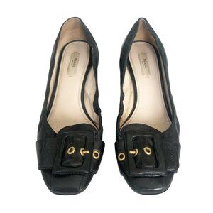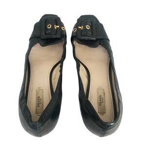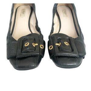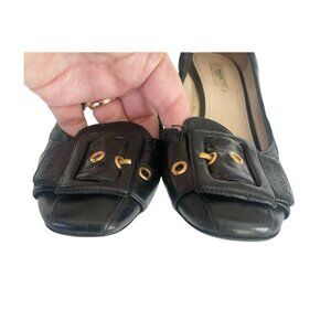 Elegant black leather flats. Features a stylish gold buckle. Perfect for any occasion.