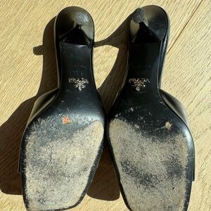 Chic black leather mules by Prada. Sleek design with a comfortable heel. Ideal for stylish outings.
