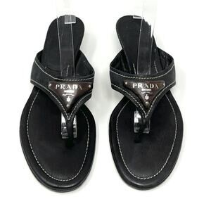 Keywords: Prada sandals, Prada logo thong, kitten heel sandals, black leather shoes, size 38.5 EU, designer summer sandals, Prada low heels, iconic Prada branding, casual luxury footwear, comfortable kitten heels, everyday designer sandals, vintage Prada shoes, leather thong sandals, summer shoes, luxury resale, retro Prada, vintage Prada, y2k Prada.