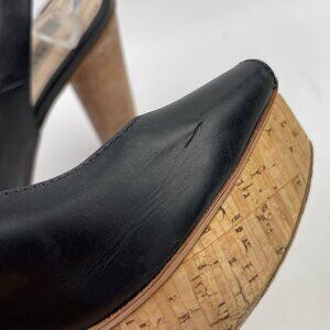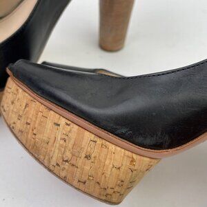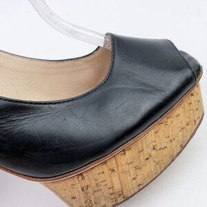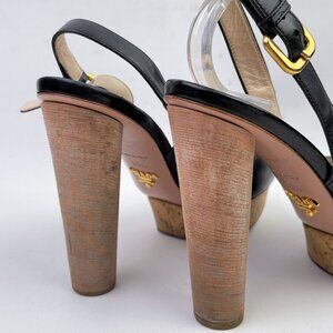 Prada Black Leather Peep Toe Cork Platform Heels w Back Straps