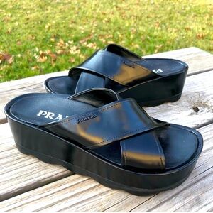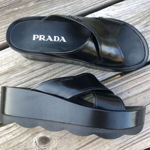 Prada Black Leather Platform Slides Y2K wavy sole 37.5
