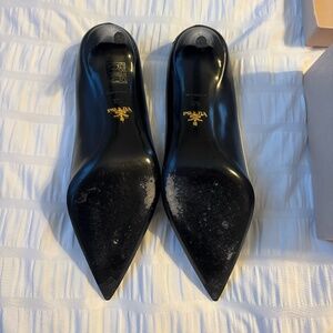 Elegant Prada pumps in smooth black leather with crisp white trim and a bow detail at the toe. Classic pointed silhouette set on a sleek stiletto heel. Lightly worn, with minor wear on soles; overall excellent condition