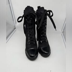 This is an authentic pair of PRADA Spazzolato Re-Nylon Metal Triangle Logo 110mm Ankle Boots size 38.5 in Black. These chic platform booties are crafted of black nylon with black leather accents. They feature lace up detailing on the front, side zippers, and 4.5-inch heels on 1-inch platform rubber soles.