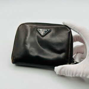 Elegant black leather wallet by Prada. Compact and stylish. Features a zip closure.