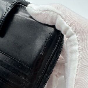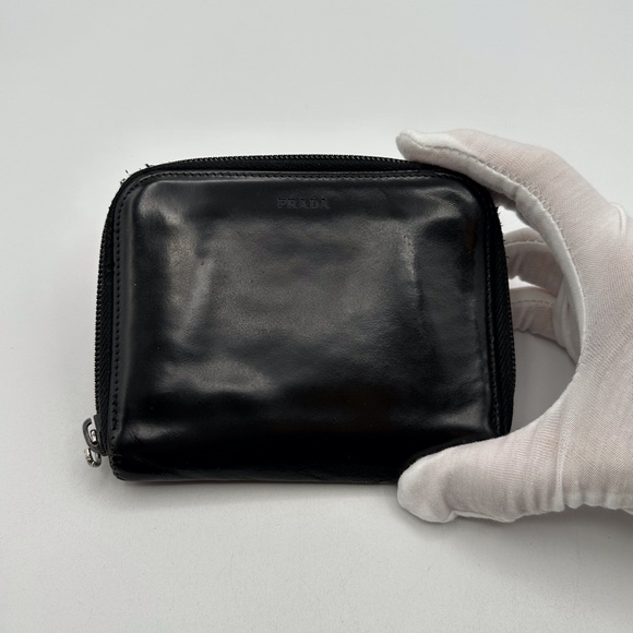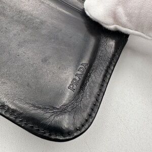 Sleek black leather wallet by Prada. Compact and stylish design.