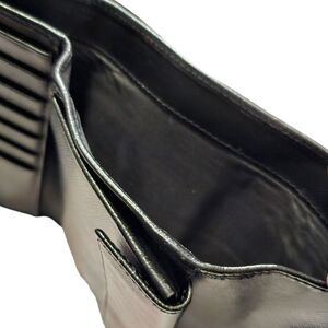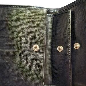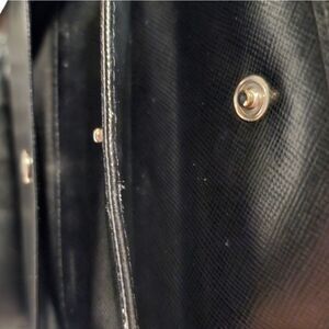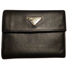 Sleek black leather wallet. Accented with a silver chain. Features Prada logo.
