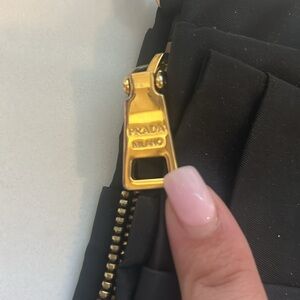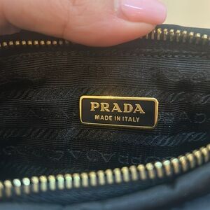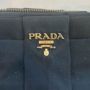 Chic Prada pouch in black satin. Features elegant gold hardware and a bow accent. Purchased by me in the Vegas boutique. Used but in good condition. 9”W x 6”H