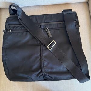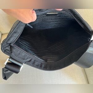 Prada black nylon crossbody bag in excellent condition. No corner wear, no rubbing on the leather trim, no tarnishing on hardware. Measures 12x14x3