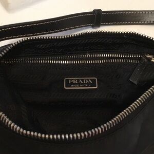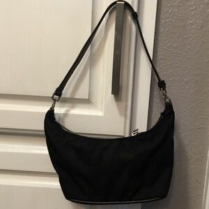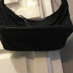 Sleek black Prada shoulder bag. Features Prada's signature durable nylon material. Perfect for everyday use, small bag that fits a lot; can be dressed up or down. Super functional amd stylish.