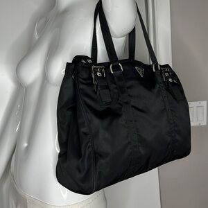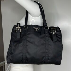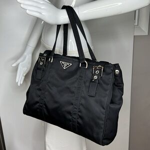 This is a beautiful Prada Black Nylon Tessuto Lightly Structured Expandable Tote Bag. Excellent pre owned condition. Expandable side snap closures and flap over adjustable buckles. 13.5” x 9.75” x 4.75” with 7.5” strap drops. Four protective feet at the bottom base. Minor scuffs to the hardware. All hardware is logo’d fully logo lined interior. Wall zipper pocket with logo shank and authentication tab in the interior on the pocket. No odors. No tears. No stains. Minor scuffs to the outer. Lightly padded and lightly structured. Made in Italy