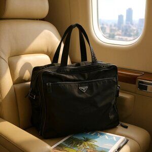 Six exterior zip pockets provide organized storage, while the spacious interior features flawless logo jacquard lining with three additional pockets. Top zip closure, protective feet at the base, and original Prada lock (no key included). Lightweight yet durable — an ideal overnight bag, weekend getaway companion, or carry-on. Includes flat top handles and attachment rings for a shoulder strap (strap not included).