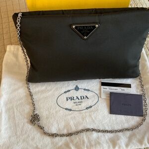 Excellent condition- one zip pocket- Prada dust bag- single chain shoulder strap nylon silver tone