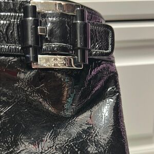 These Prada casual boots boast a sleek black patent leather. The knee-high silhouette and buckle design provide a sophisticated yet effortless style. Perfect for elevating any casual ensemble with a touch of luxury. Some scratches on leather and cracks as photographed.