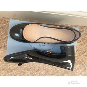 Black patent leather Prada ballet slipper style heels, will small bow and Prada logo on the toe. Perfect condition, only worn around the house. Comes with original box and dust bags. Size IT 39.5 or US women's 9.