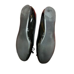 Elegant black flats with a glossy finish. Features a delicate bow accent. Perfect for any occasion.