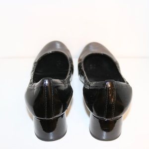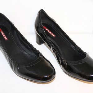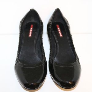 Prada Black Patent Leather Ballet Heels: Step into luxury with these exquisite Prada ballet heels. Crafted from premium black patent leather, these shoes exemplify sophistication and comfort in one. The glossy finish adds a touch of elegance, making them the perfect addition to elevate any outfit.