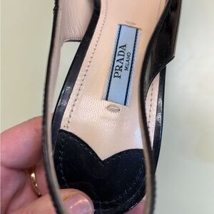 These Prada heels feature a glossy black patent leather finish with a chic peep-toe design and a stylish slingback strap. The high heels add a touch of elegance, making them perfect for formal occasions.