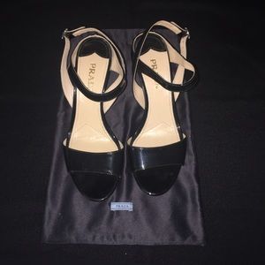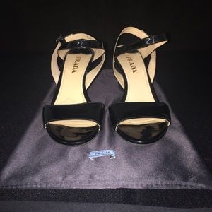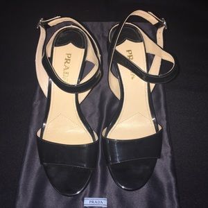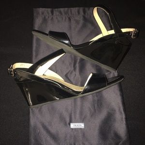Prada Black patent leather wedge sandal. In near perfect condition. Leather lining, rubber sole. Made in Italy. Comes with sleeper.